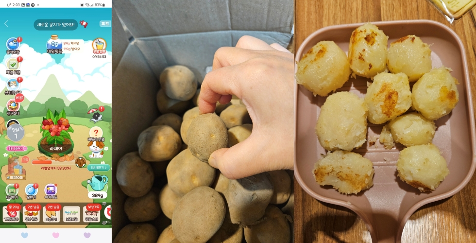 2) 올팜---인터넷으로 작물을 키우는 앱이다."올웨이즈"라는 어플에서 "올팜"이라는 가상 작물 키우기인데 열심히 부지런히 키우면 이렇게 진짜 작물을 수확할 수 있다. 부지런한 저의 시엄니는 계란,오렌지,고구마 등등을 여러번 수확했다.덜 부지런한 나는 첨으로 감자를 수확하고 지금은 커피를 키우고 있다. 곧 수확할 수 있을거 같다.